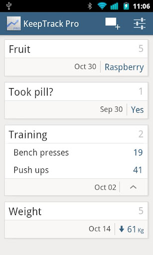 Achieve your goals and deadlines with KeepTrack! KeepTrack is a utility for collecting and viewing the statistics in your life from the comfort of your mobile phone. KeepTrack is generic and does not pre define the data you are collecting so whether it is your weight, training records, pills consumption, number of coffee cups or cigarettes you had today or any other data you can come up which requires tracking - KeepTrack can collect the data and show you the statistics. KeepTrack is easy to use and understand and got many praise from users on its intuitive interface.
